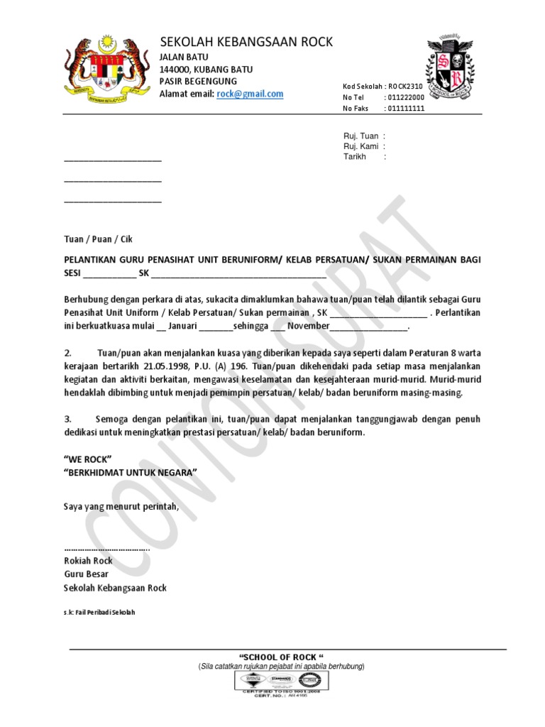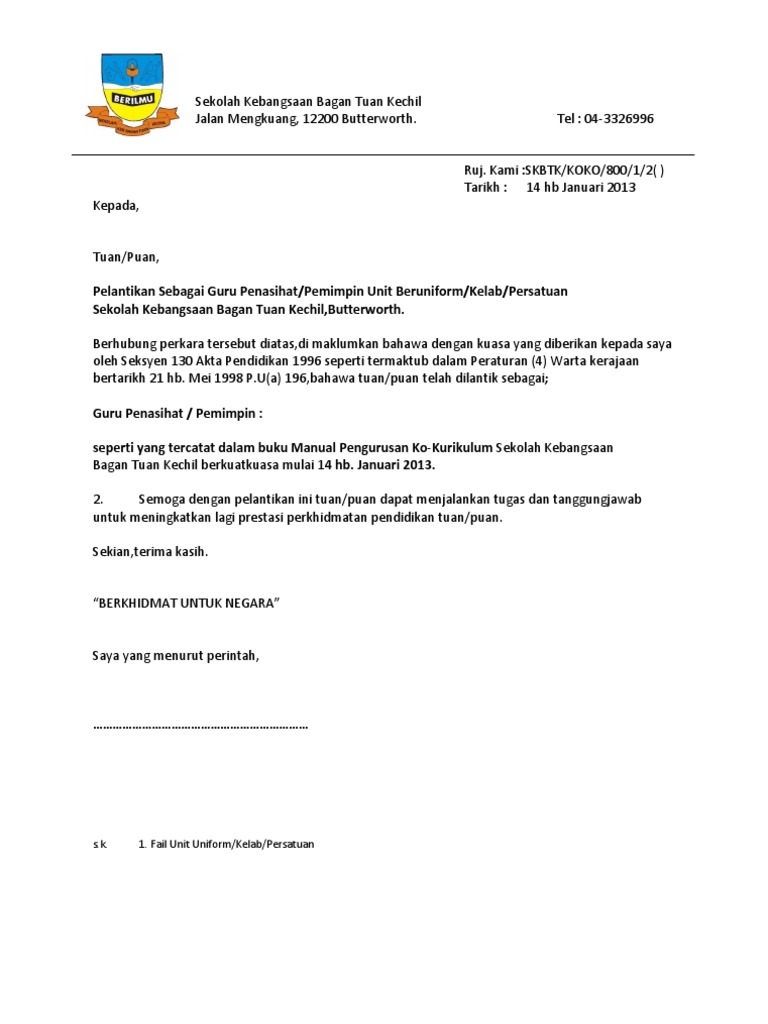 Tuan Perlantikan Sebagai Guru Penasihat Pergerakan Pengakap Sekolah Menengah. Pengetua Sekolah Menengah Kebangsaan. Surat Perlantikan Guru PemimpinPenasihat Persatuan Sekolah Menegah Kebangsaan Bandar Jalan Padi Ria 1 81200 Johor Bahru.